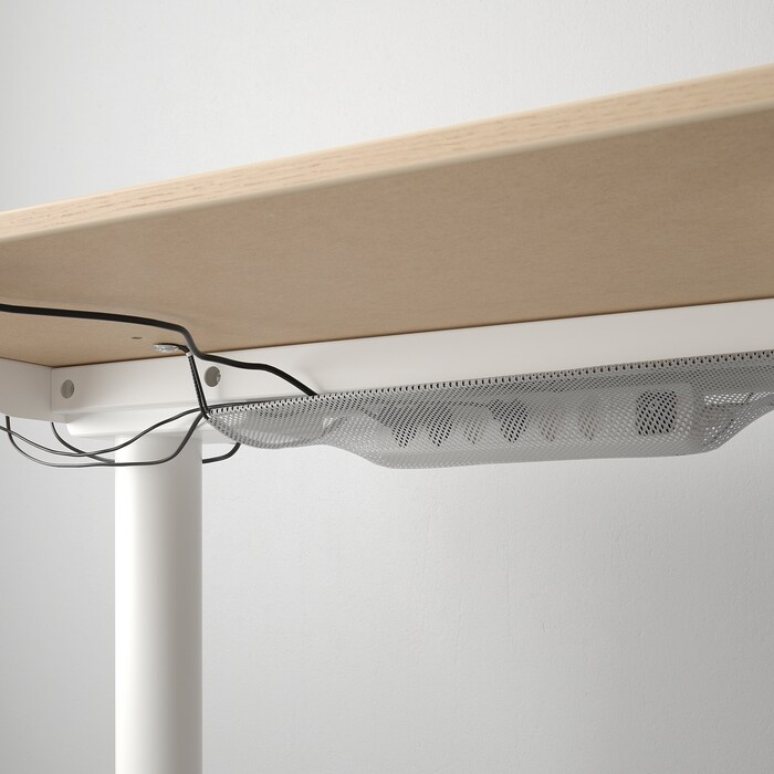 Desk sit/stand, white stained oak veneer/white. This sturdy desk is built to outlast years of coffee and hard work. You get a generous work surface and a clever solution to keep cords in place underneath. 10-year Limited Warranty. Read about the terms in the Limited Warranty brochure. Changing positions between sitting and standing helps you move your body so you both feel and work better. You can adjust the height of the tabletop electrically from 25⅝" to 49¼" to ensure an ergonomic working position. It’s easy to keep your desk neat and tidy with the cable management net under the tabletop. Contoured table top; provides support to the wrists and forearms when writing. Designer K Malmvall/E Lilja Löwenhielm